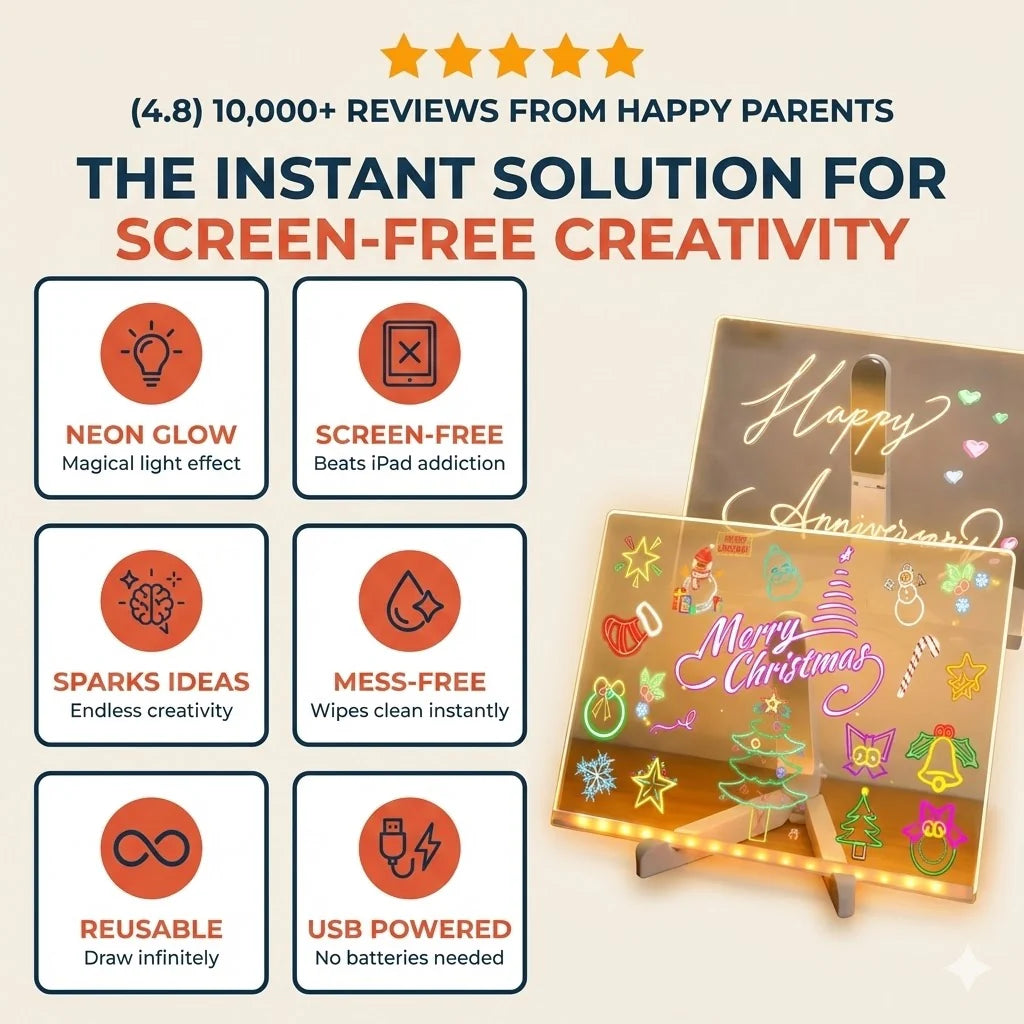 Kids love drawing on it and watching their creations glow. —no apps, no noise, just pure creativity. It’s quiet, calming, and perfect for independent play, whether at home, in the car, or out at dinner.